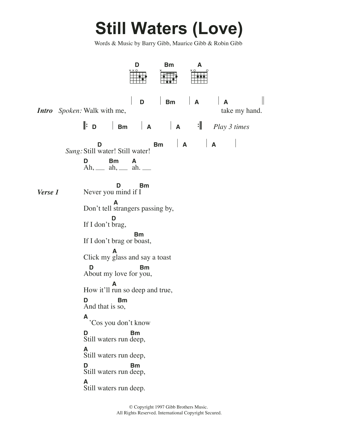 Download or print Bee Gees Still Waters Run Deep sheet music, chords and digital score arranged for Guitar Chords/Lyrics. This Pop score includes 2 page(s).