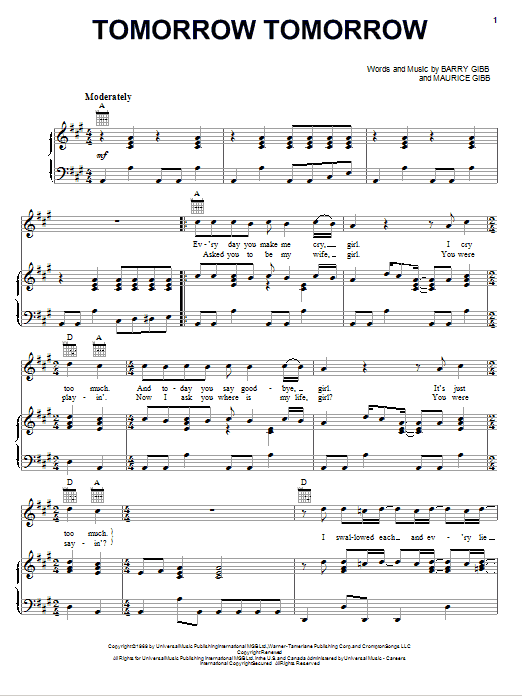 Download or print Bee Gees Tomorrow Tomorrow sheet music, chords and digital score arranged for Piano, Vocal & Guitar Chords (Right-Hand Melody). This Disco score includes 4 page(s).