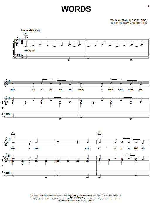 Download or print Bee Gees Words sheet music, chords and digital score arranged for Really Easy Piano. This Pop score includes 2 page(s).