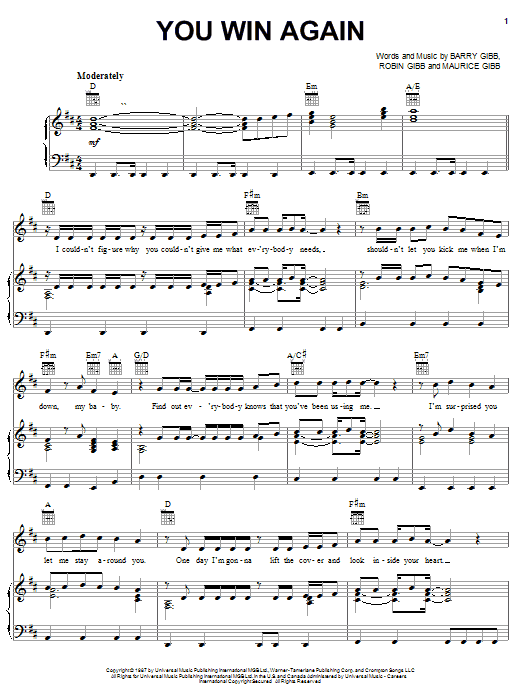 Download or print Bee Gees You Win Again sheet music, chords and digital score arranged for Piano, Vocal & Guitar Chords. This Pop score includes 7 page(s).