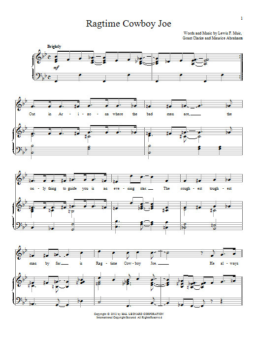 Download or print Belle Baker Ragtime Cowboy Joe sheet music, chords and digital score arranged for Piano & Vocal. This Standards score includes 3 page(s).