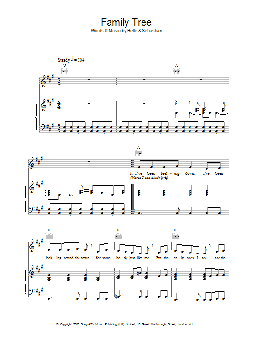 Download or print Belle And Sebastian Family Tree sheet music, chords and digital score arranged for Piano, Vocal & Guitar Chords. This Alternative score includes 6 page(s).