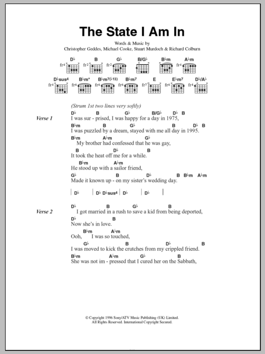 Download or print Belle & Sebastian The State I Am In sheet music, chords and digital score arranged for Guitar Chords/Lyrics. This Rock score includes 3 page(s).