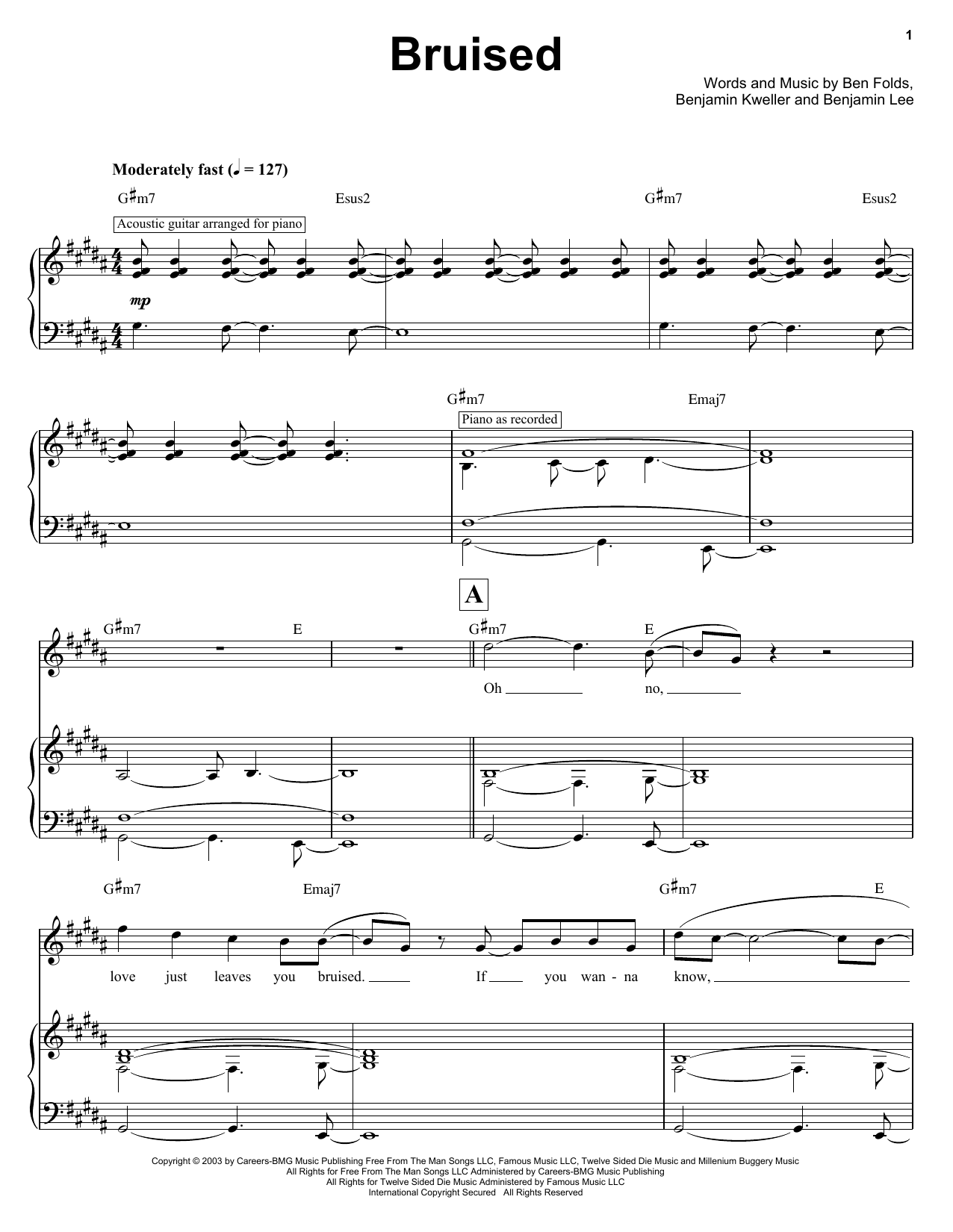 Download or print Ben Folds Bruised sheet music, chords and digital score arranged for Keyboard Transcription. This Pop score includes 11 page(s).