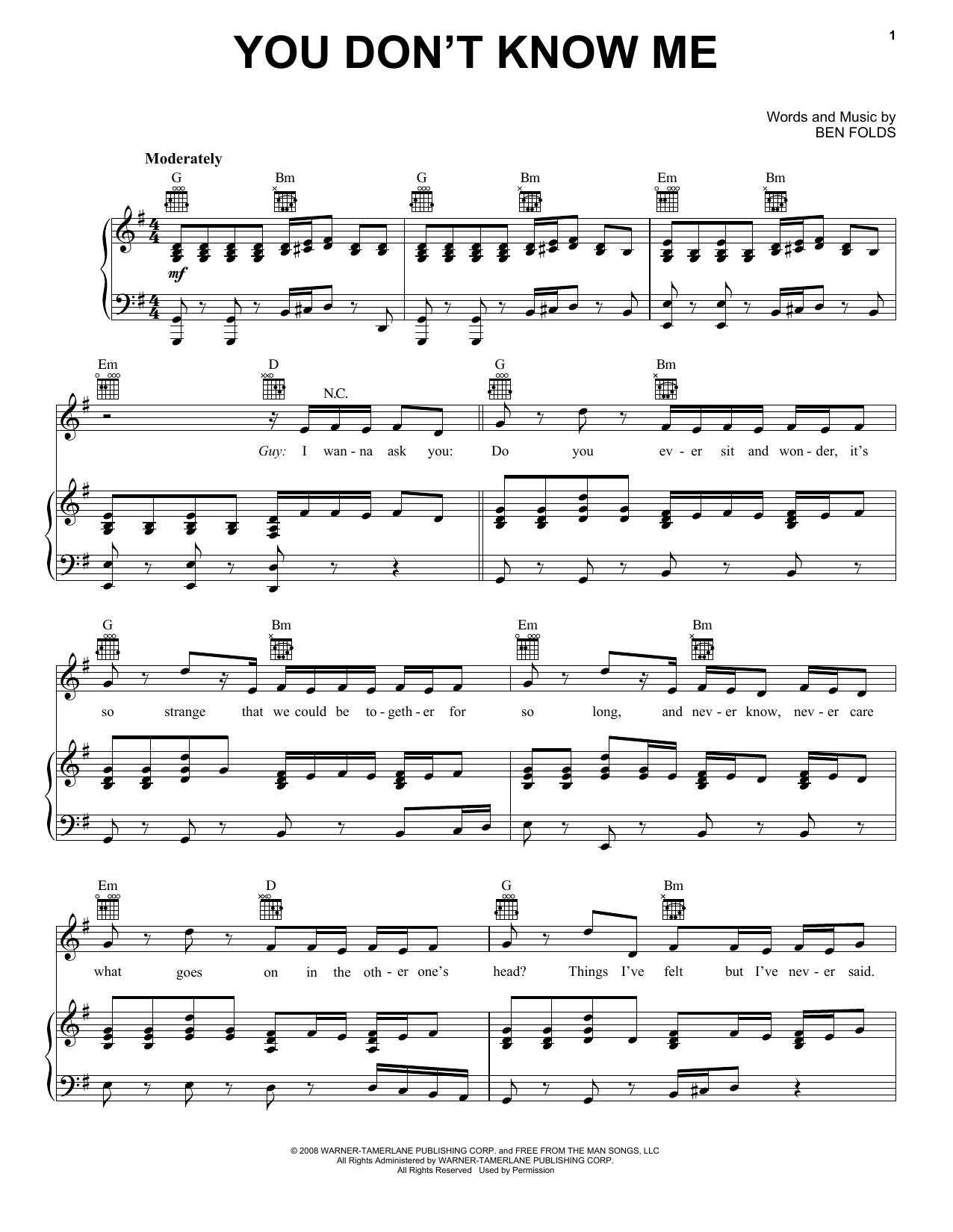 Download or print Ben Folds Five You Don't Know Me sheet music, chords and digital score arranged for Piano, Vocal & Guitar Chords (Right-Hand Melody). This Folk score includes 8 page(s).