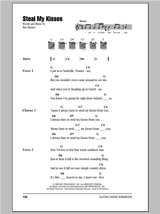 Download or print Ben Harper And The Innocent Criminals Steal My Kisses sheet music, chords and digital score arranged for Piano, Vocal & Guitar Chords (Right-Hand Melody). This Folk score includes 8 page(s).