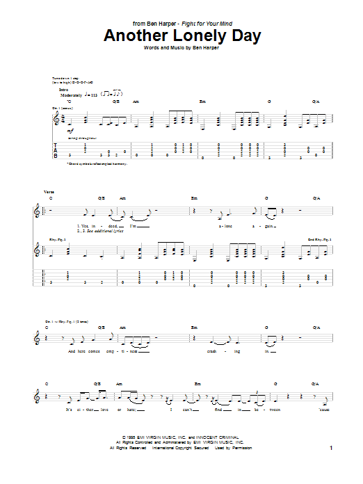 Download or print Ben Harper Another Lonely Day sheet music, chords and digital score arranged for Guitar Tab. This Pop score includes 3 page(s).