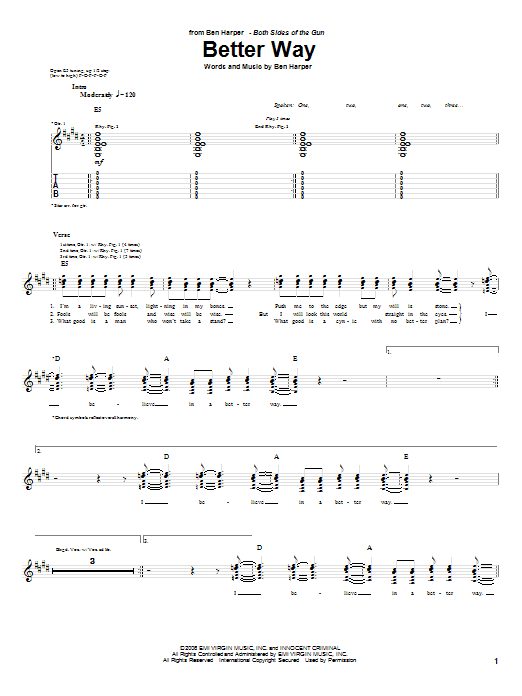 Download or print Ben Harper Better Way sheet music, chords and digital score arranged for Guitar Tab. This Pop score includes 4 page(s).