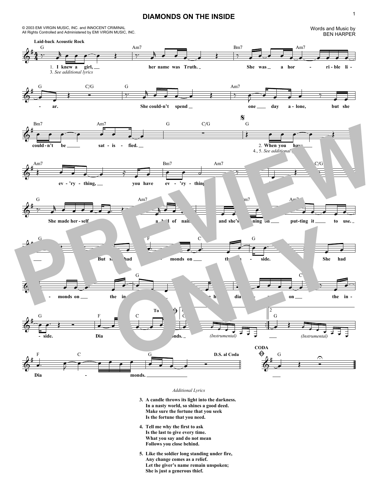 Download or print Ben Harper Diamonds On The Inside sheet music, chords and digital score arranged for Lead Sheet / Fake Book. This Pop score includes 1 page(s).