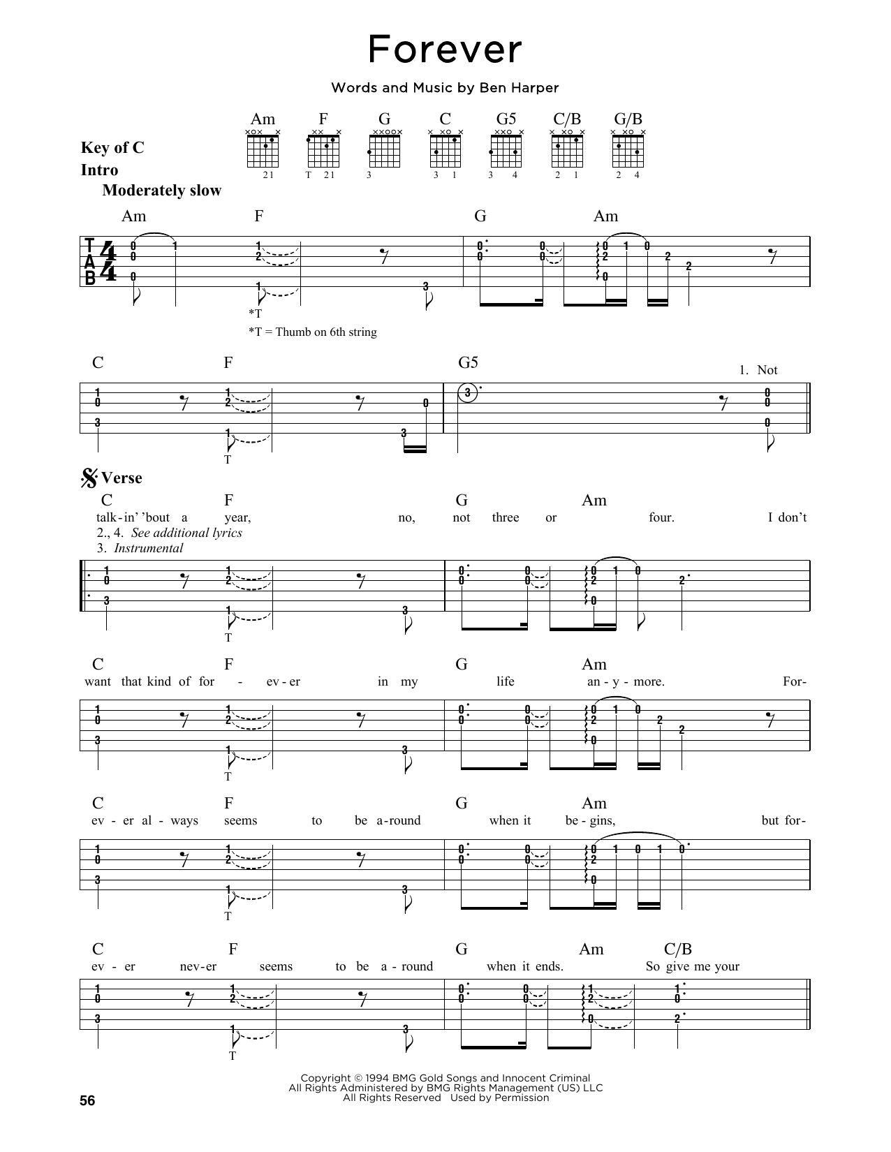 Download or print Ben Harper Forever sheet music, chords and digital score arranged for Guitar Chords/Lyrics. This Folk score includes 2 page(s).