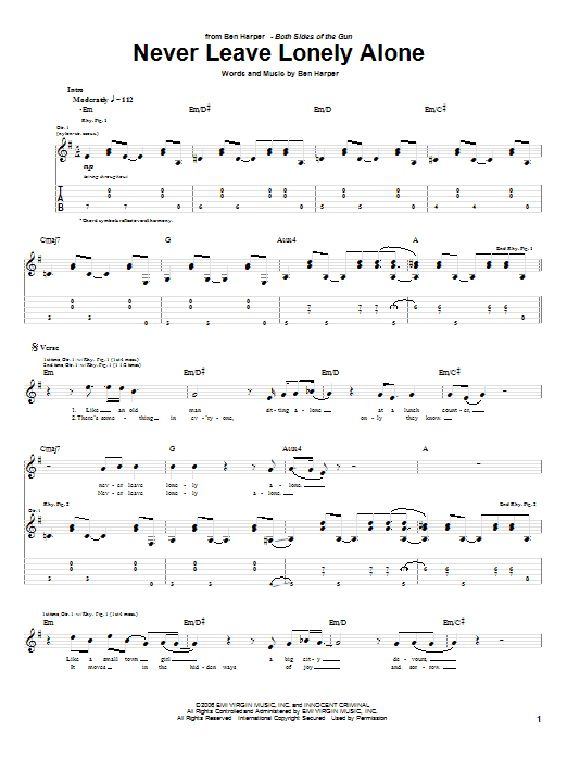 Download or print Ben Harper Never Leave Lonely Alone sheet music, chords and digital score arranged for Guitar Tab. This Pop score includes 3 page(s).
