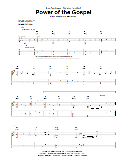 Download or print Ben Harper Power Of The Gospel sheet music, chords and digital score arranged for Guitar Tab. This Pop score includes 6 page(s).