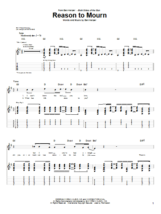 Download or print Ben Harper Reason To Mourn sheet music, chords and digital score arranged for Guitar Tab. This Pop score includes 5 page(s).