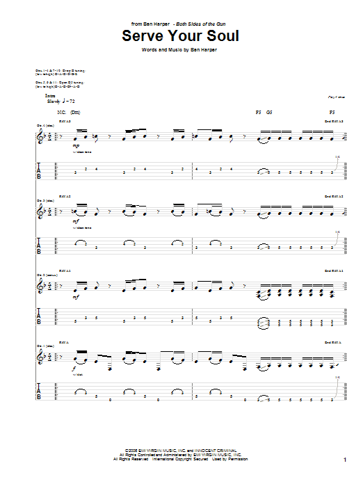 Download or print Ben Harper Serve Your Soul sheet music, chords and digital score arranged for Guitar Tab. This Pop score includes 17 page(s).