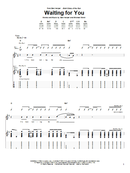 Download or print Ben Harper Waiting For You sheet music, chords and digital score arranged for Guitar Tab. This Pop score includes 11 page(s).