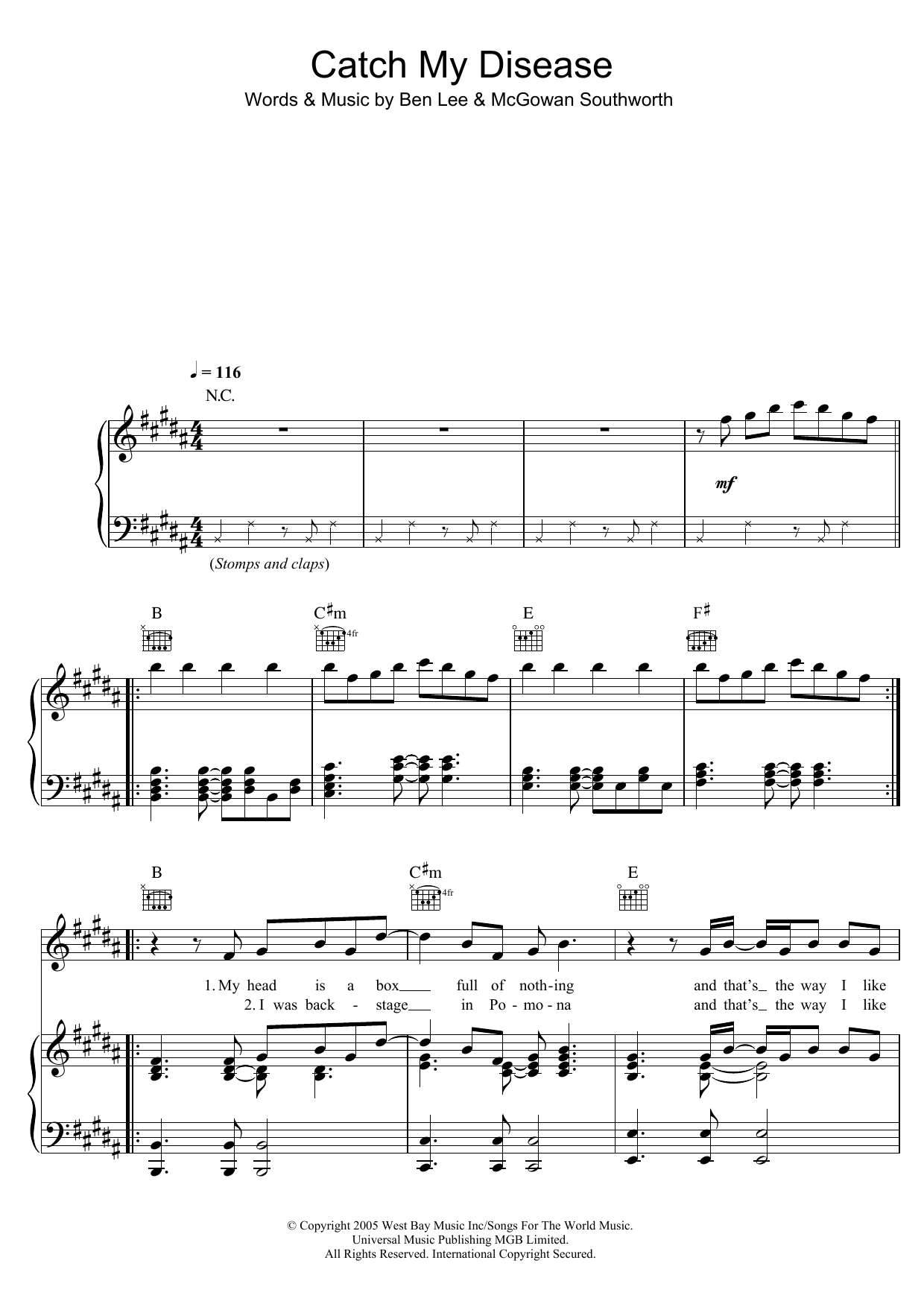 Download or print Ben Lee Catch My Disease sheet music, chords and digital score arranged for Piano, Vocal & Guitar Chords. This Pop score includes 9 page(s).
