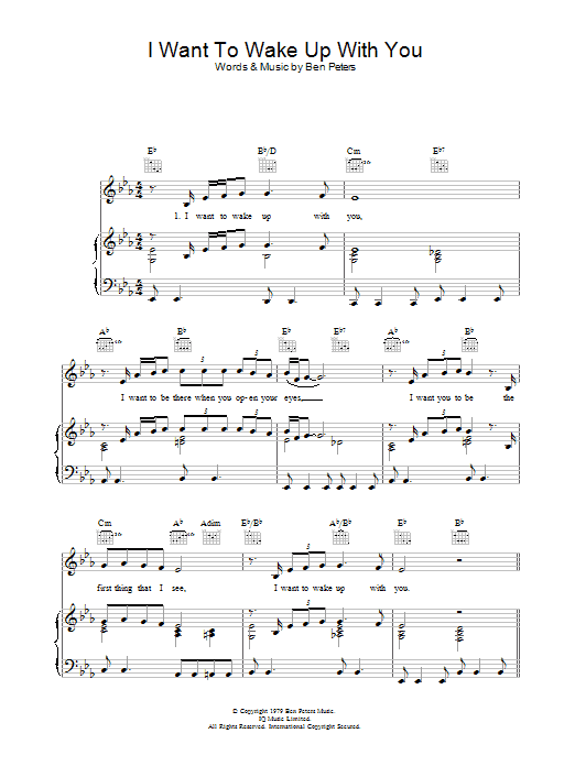 Download or print Ben Peters I Want To Wake Up With You sheet music, chords and digital score arranged for Piano, Vocal & Guitar Chords. This Pop score includes 3 page(s).