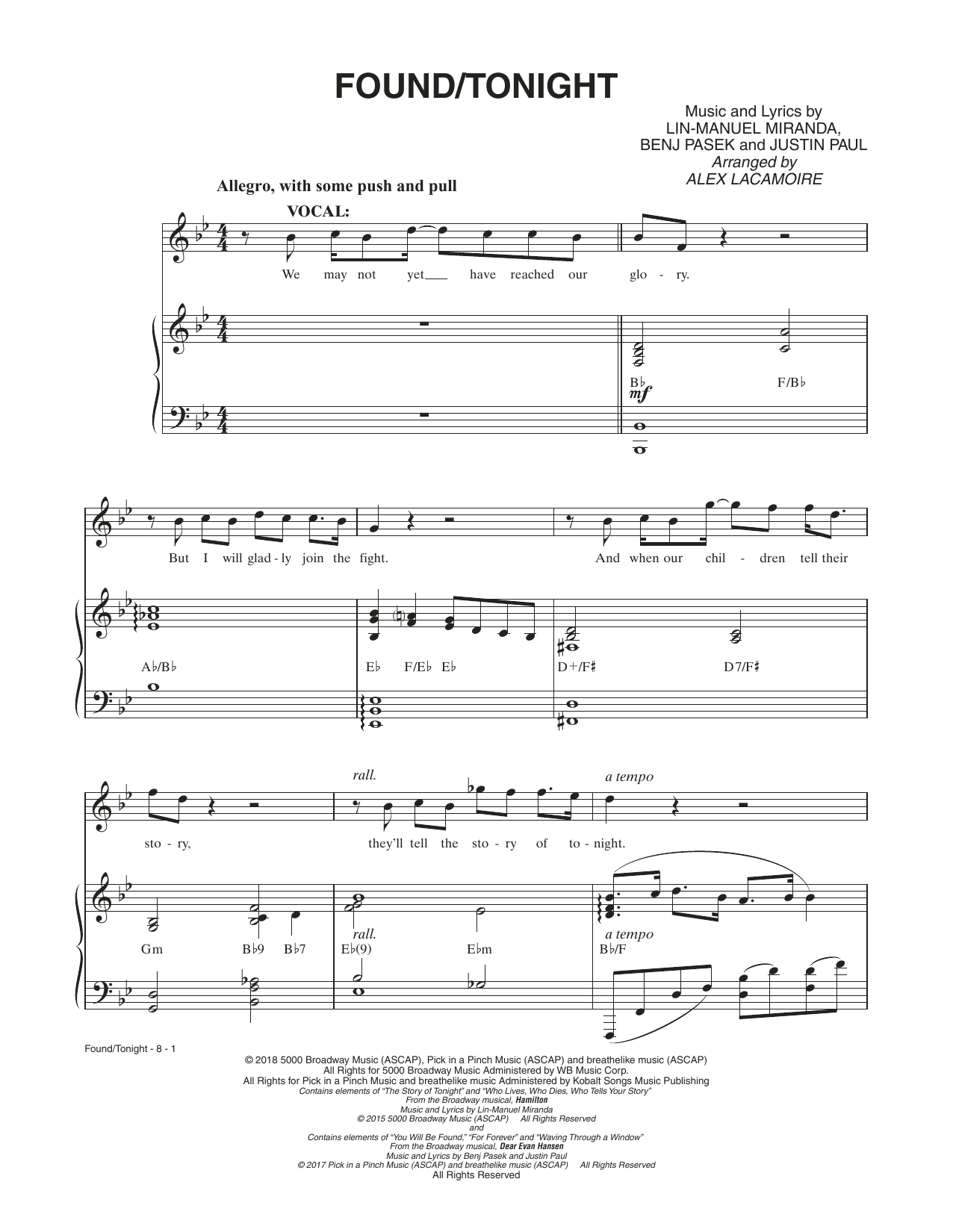 Download or print Ben Platt & Lin-Manuel Miranda Found/Tonight sheet music, chords and digital score arranged for Piano & Vocal. This Musical/Show score includes 8 page(s).