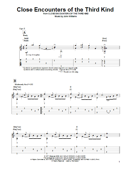 Download or print John Williams Theme From Close Encounters Of The Third Kind (arr. Ben Woolman) sheet music, chords and digital score arranged for Solo Guitar. This Classical score includes 3 page(s).