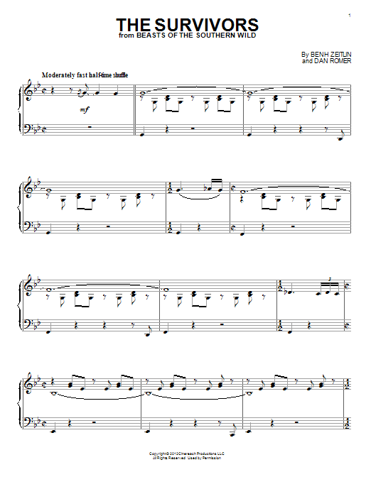 Download or print Benh Zeitlin Survivors sheet music, chords and digital score arranged for Piano Solo. This Pop score includes 6 page(s).