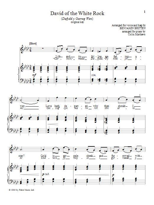 Download or print Benjamin Britten David of the White Rock sheet music, chords and digital score arranged for Piano & Vocal. This Classical score includes 4 page(s).