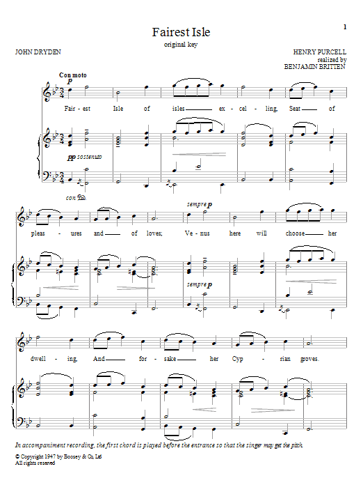 Download or print Benjamin Britten Fairest Isle sheet music, chords and digital score arranged for Piano & Vocal. This Classical score includes 3 page(s).