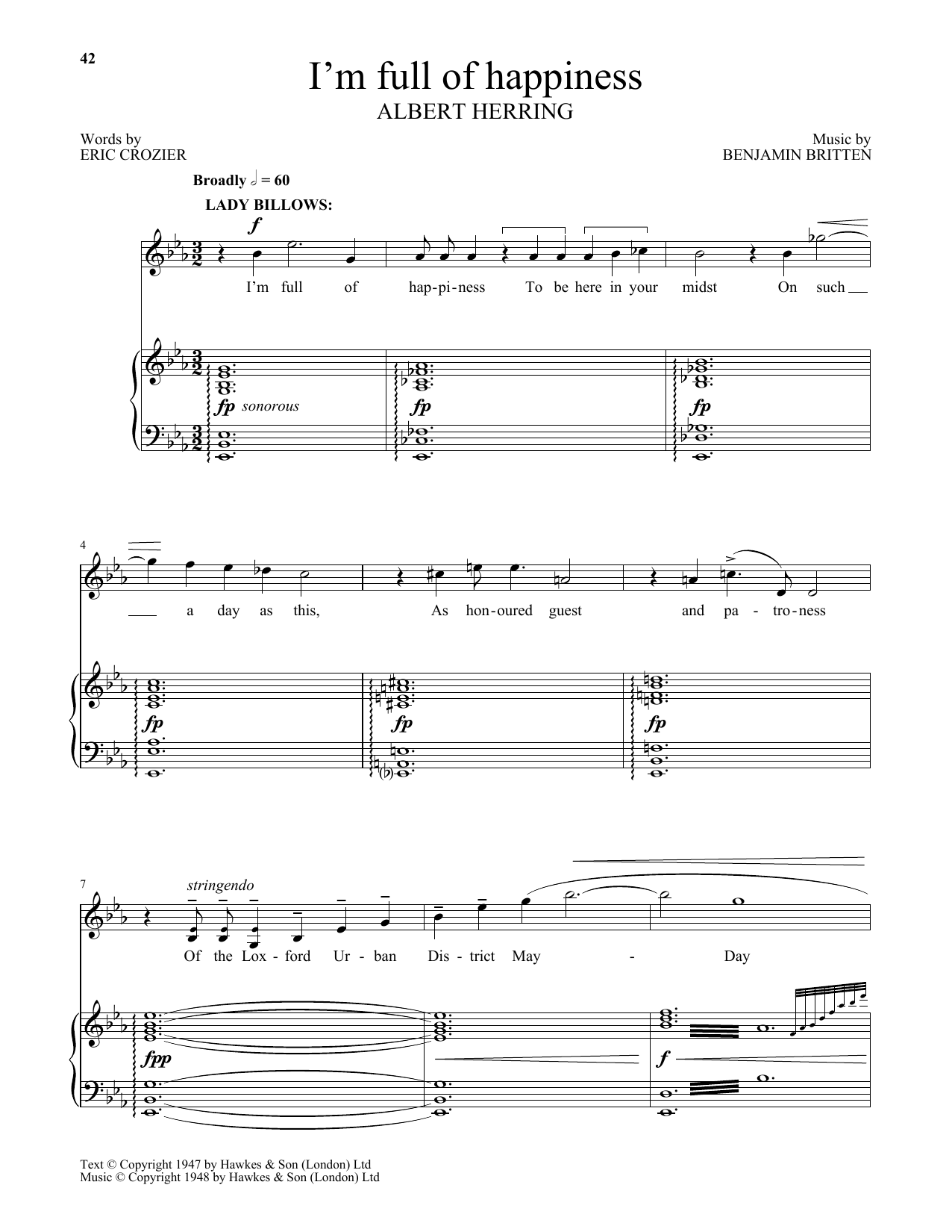 Download or print Benjamin Britten I'm full of happiness (from Albert Herring) sheet music, chords and digital score arranged for Piano & Vocal. This Classical score includes 7 page(s).