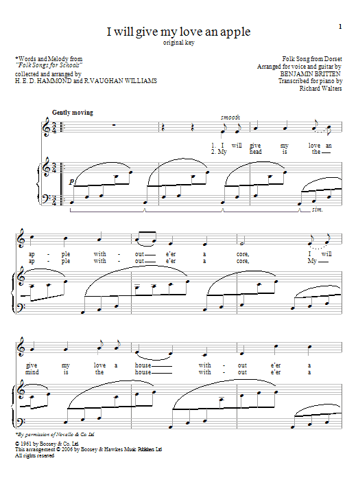 Download or print Benjamin Britten I Will Give My Love An Apple sheet music, chords and digital score arranged for Piano & Vocal. This Classical score includes 2 page(s).