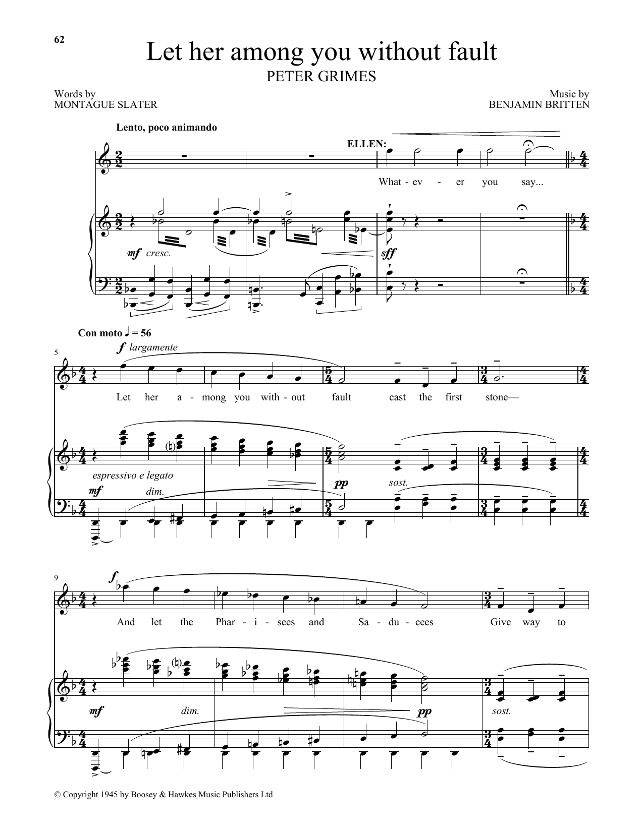 Download or print Benjamin Britten Let her among you without fault (from Peter Grimes) sheet music, chords and digital score arranged for Piano & Vocal. This Classical score includes 2 page(s).