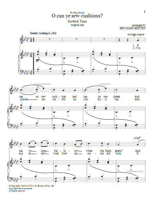 Download or print Benjamin Britten O can ye sew cushions? sheet music, chords and digital score arranged for Piano & Vocal. This Classical score includes 2 page(s).