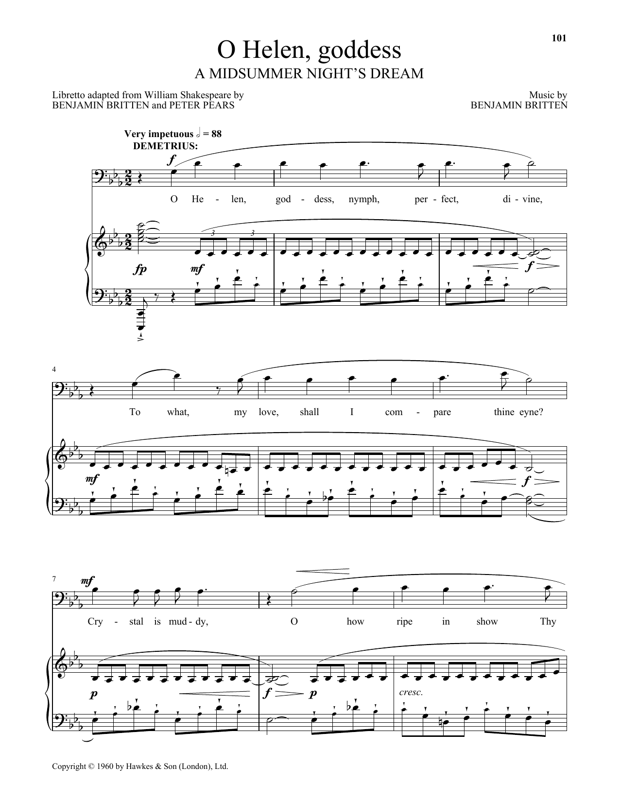 Download or print Benjamin Britten O Helen, goddess (from A Midsummer Night's Dream) sheet music, chords and digital score arranged for Piano & Vocal. This Classical score includes 3 page(s).