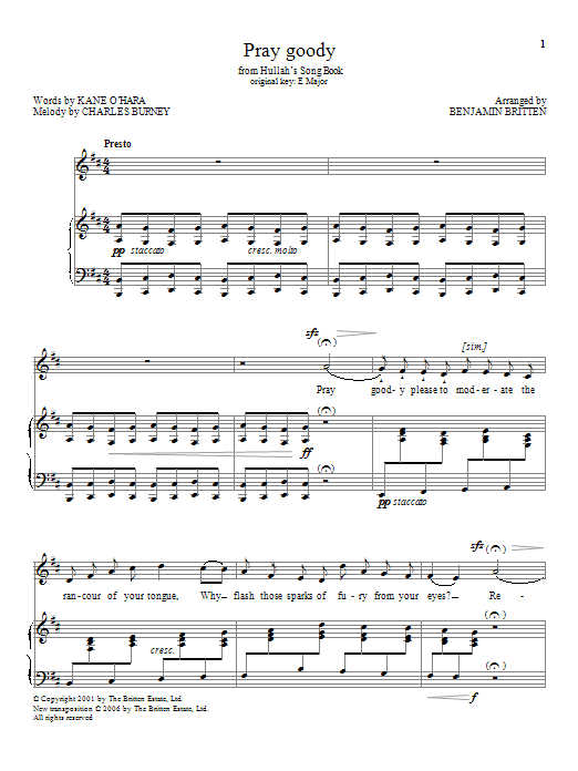 Download or print Benjamin Britten Pray goody sheet music, chords and digital score arranged for Piano & Vocal. This Classical score includes 3 page(s).