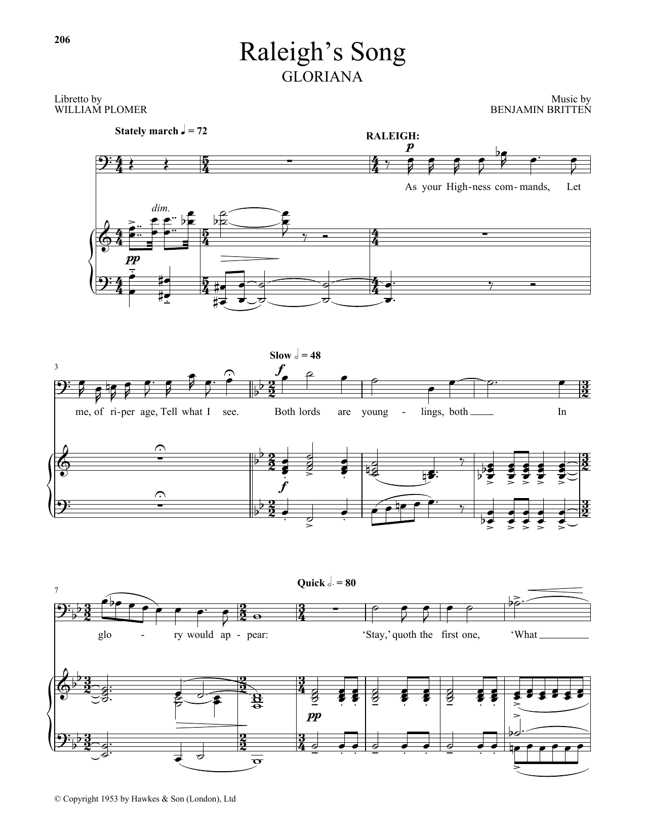 Download or print Benjamin Britten Raleigh's Song (from Gloriana) sheet music, chords and digital score arranged for Piano & Vocal. This Classical score includes 3 page(s).