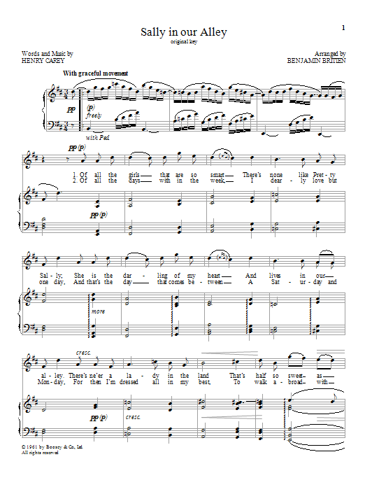 Download or print Benjamin Britten Sally in our Alley sheet music, chords and digital score arranged for Piano & Vocal. This Classical score includes 4 page(s).