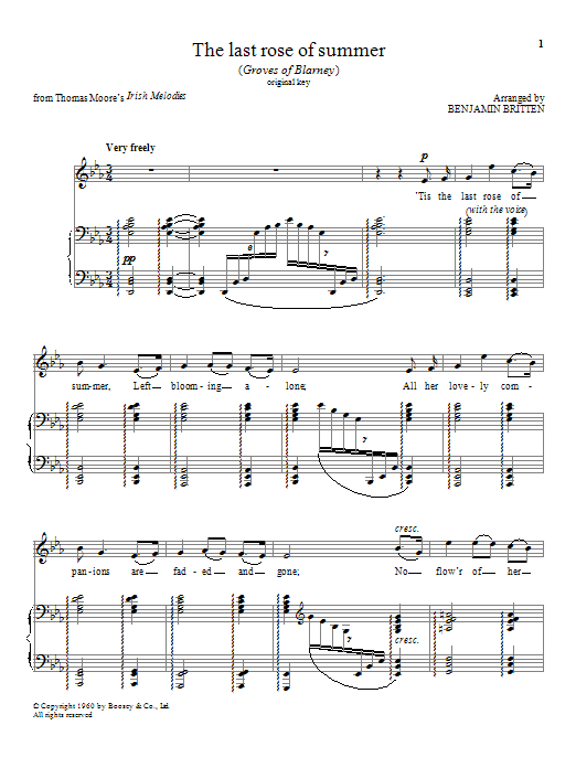 Download or print Benjamin Britten The last rose of summer sheet music, chords and digital score arranged for Piano & Vocal. This Classical score includes 4 page(s).