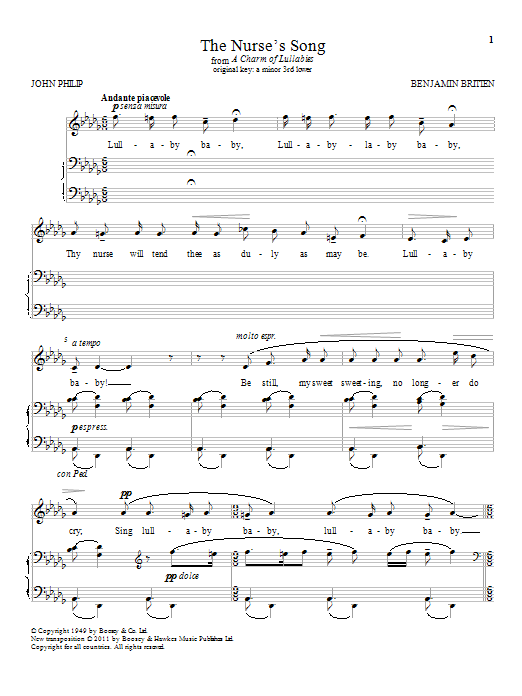 Download or print Benjamin Britten The Nurse's Song sheet music, chords and digital score arranged for Piano & Vocal. This Classical score includes 4 page(s).