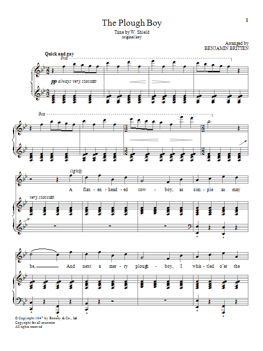 Download or print Benjamin Britten The Plough Boy sheet music, chords and digital score arranged for Piano & Vocal. This Classical score includes 5 page(s).