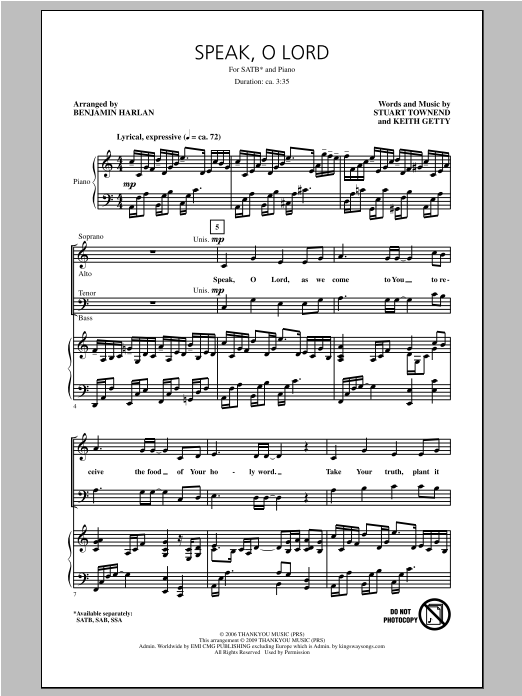 Download or print Keith & Kristyn Getty Speak O Lord (arr. Benjamin Harlan) sheet music, chords and digital score arranged for SATB Choir. This Christian score includes 7 page(s).