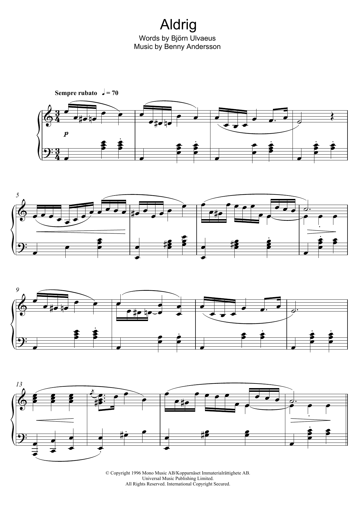 Download or print Benny Andersson Aldrig sheet music, chords and digital score arranged for Piano Solo. This Pop score includes 5 page(s).