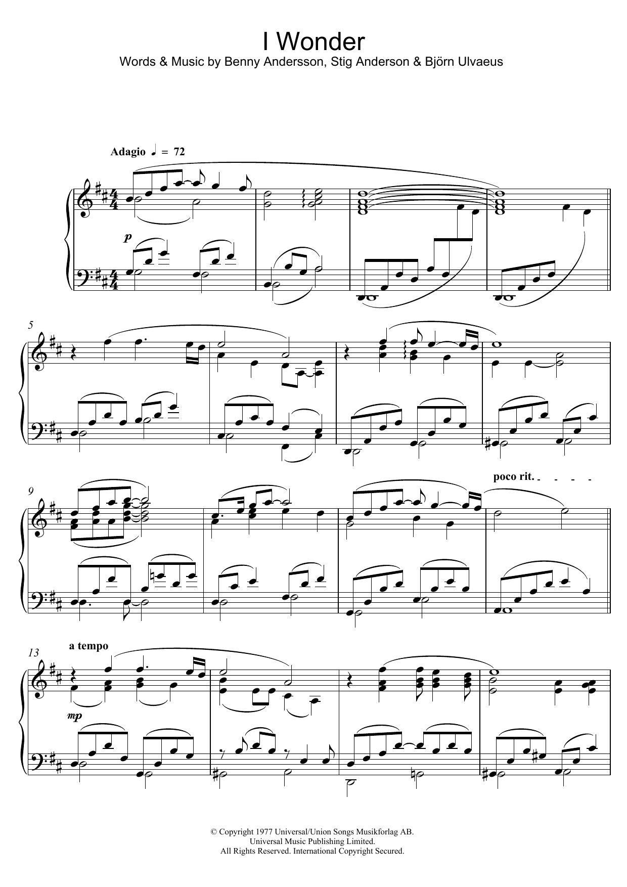 Download or print Benny Andersson I Wonder sheet music, chords and digital score arranged for Piano Solo. This Pop score includes 4 page(s).