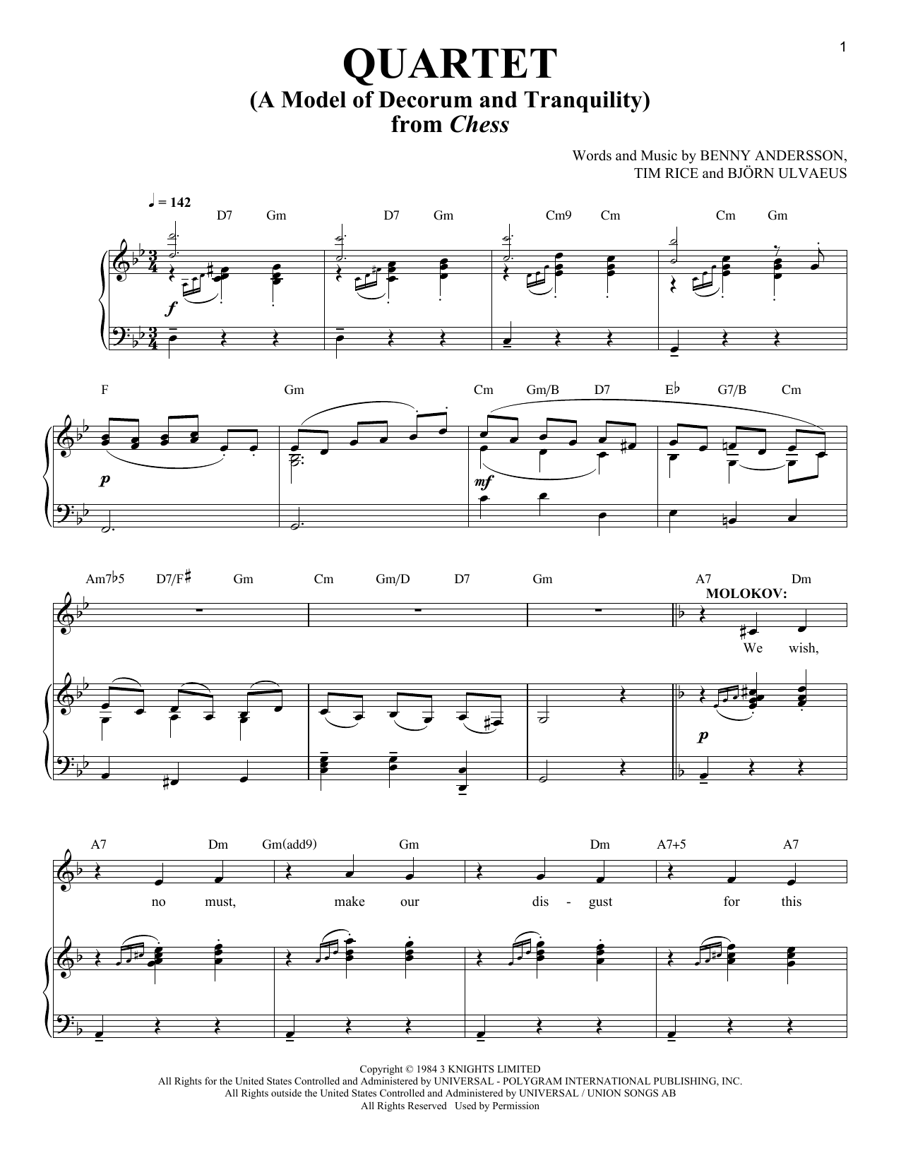 Download or print Benny Andersson Quartet (A Model Of Decorum and Tranquility) sheet music, chords and digital score arranged for Piano & Vocal. This Musical/Show score includes 15 page(s).