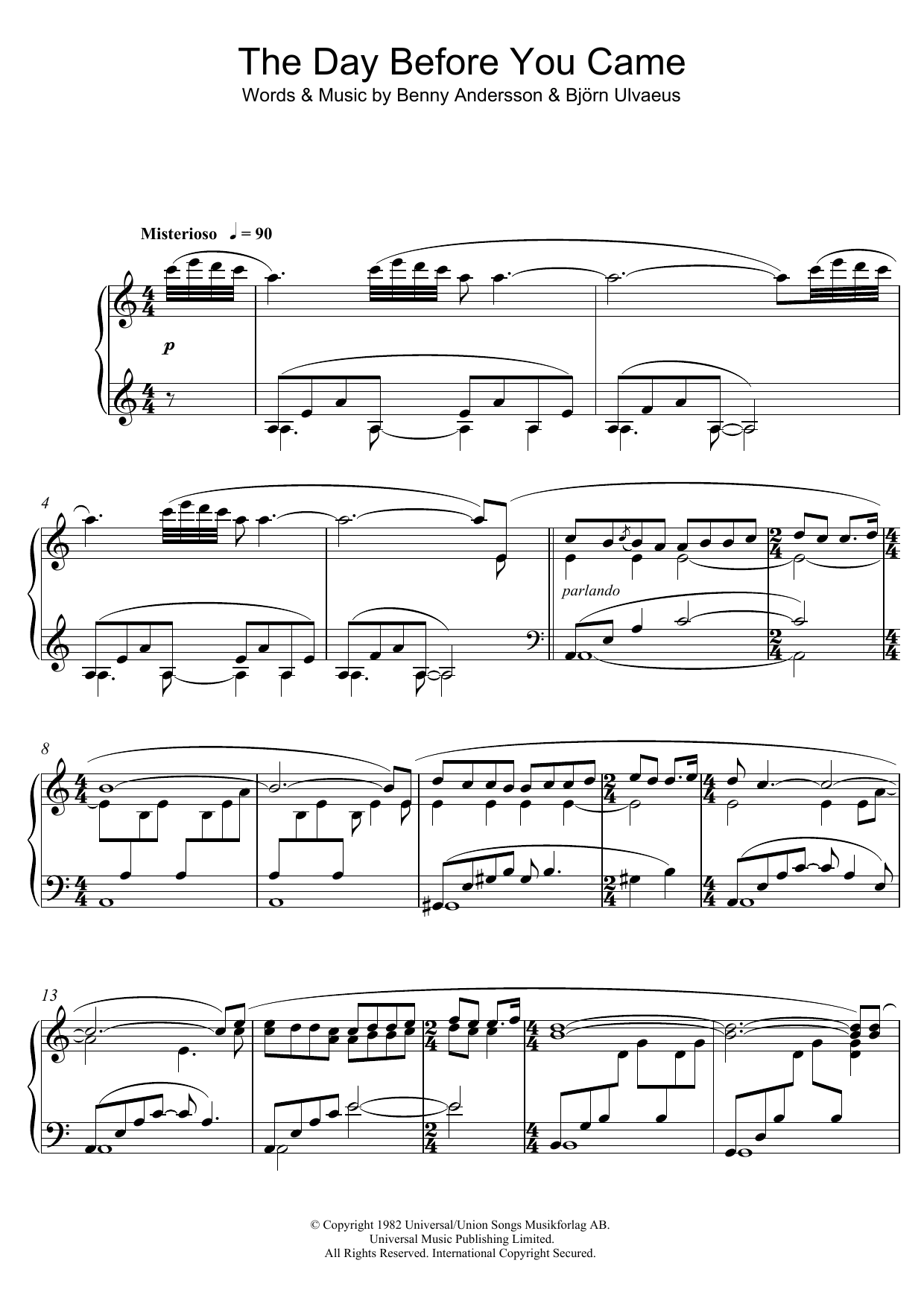 Download or print Benny Andersson The Day Before You Came sheet music, chords and digital score arranged for Piano Solo. This Pop score includes 6 page(s).