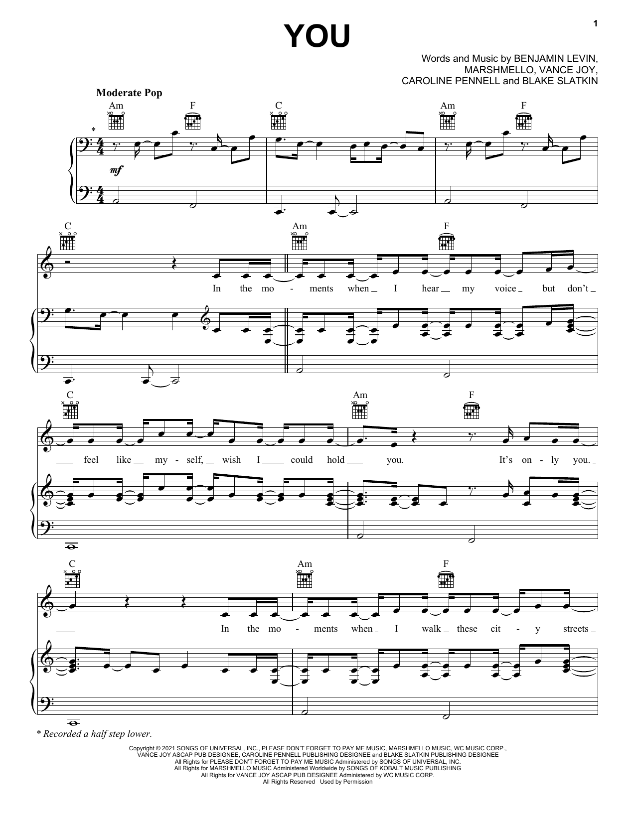 Download or print benny blanco You (with Marshmello & Vance Joy) sheet music, chords and digital score arranged for Piano, Vocal & Guitar Chords (Right-Hand Melody). This Pop score includes 6 page(s).