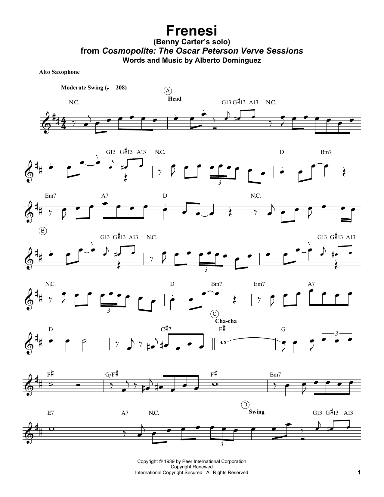 Download or print Benny Carter Frenesí sheet music, chords and digital score arranged for Alto Sax Transcription. This Jazz score includes 6 page(s).