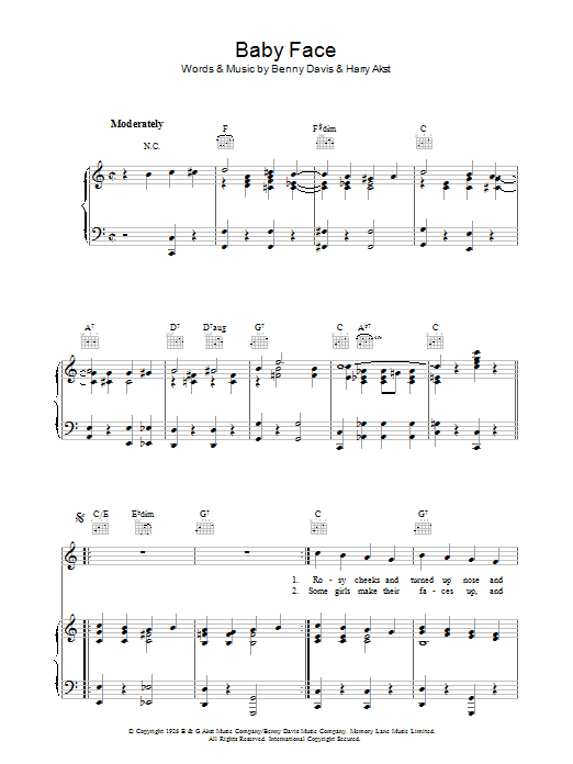 Download or print Benny Davis Baby Face sheet music, chords and digital score arranged for Piano, Vocal & Guitar Chords. This Pop score includes 6 page(s).