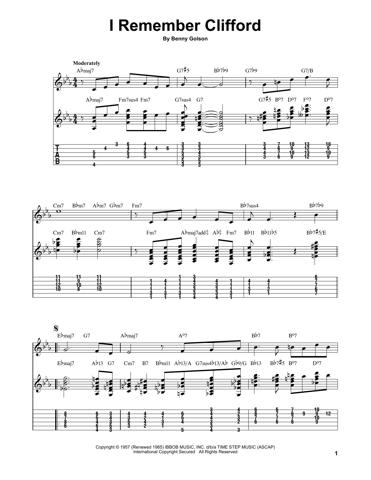 Download or print Benny Golson I Remember Clifford (arr. Robert B. Yelin) sheet music, chords and digital score arranged for Easy Guitar Tab. This Jazz score includes 3 page(s).