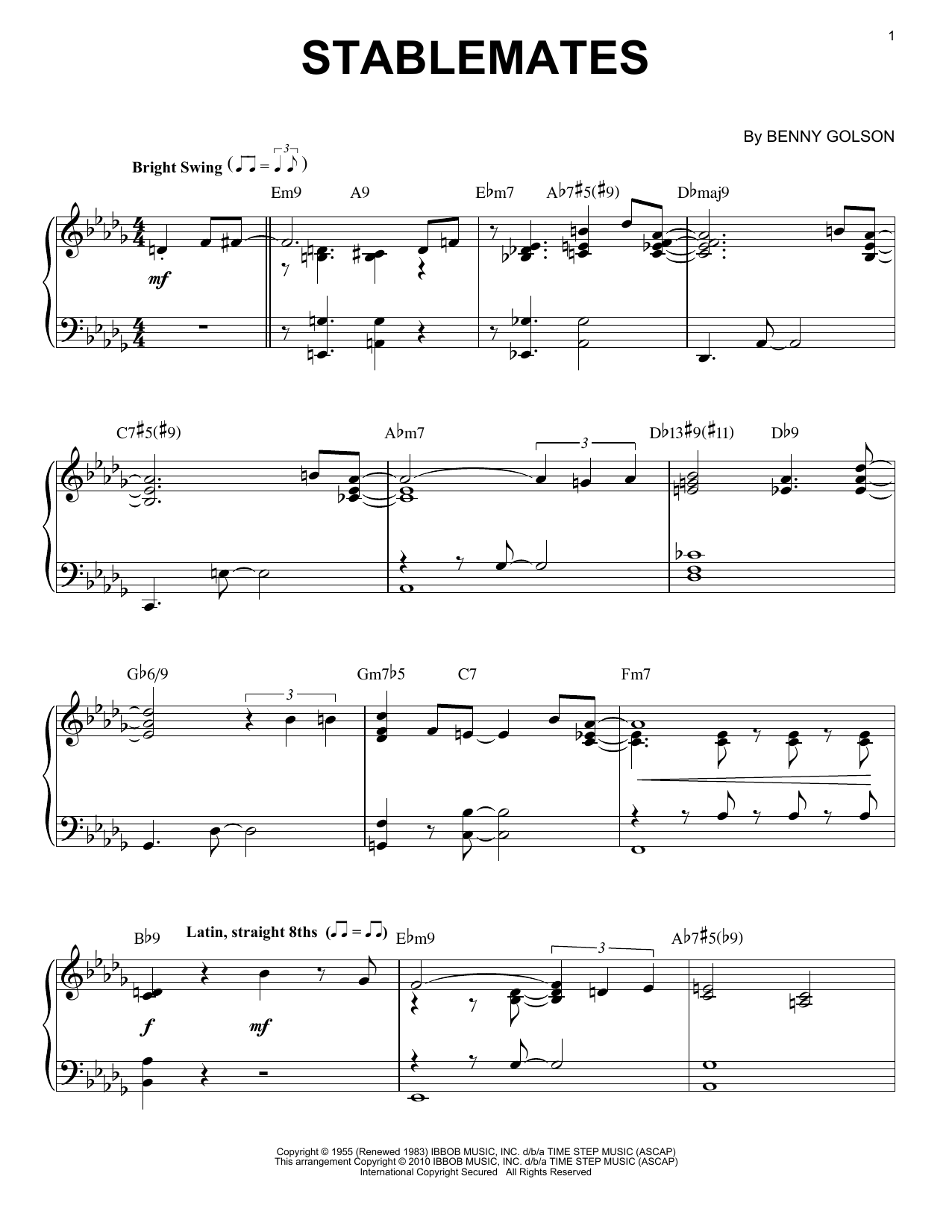 Download or print Benny Golson Stablemates (arr. Brent Edstrom) sheet music, chords and digital score arranged for Piano Solo. This Jazz score includes 4 page(s).