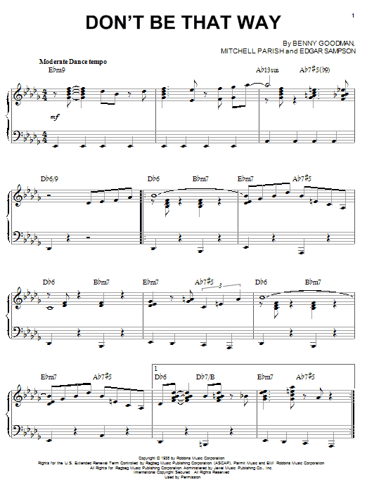 Download or print Benny Goodman Don't Be That Way sheet music, chords and digital score arranged for Piano, Vocal & Guitar Chords (Right-Hand Melody). This Jazz score includes 3 page(s).
