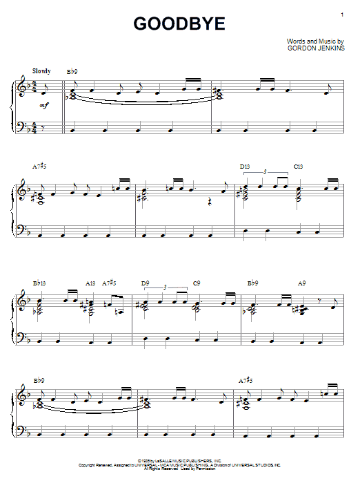 Download or print Benny Goodman Goodbye sheet music, chords and digital score arranged for Piano, Vocal & Guitar Chords (Right-Hand Melody). This Jazz score includes 3 page(s).