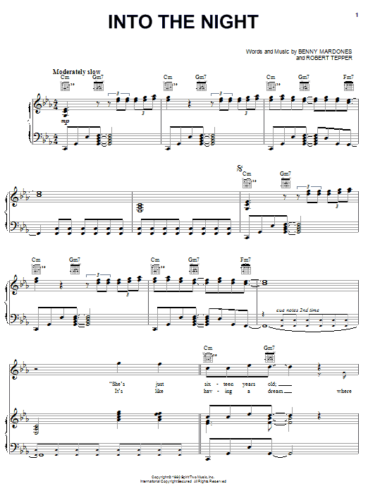 Download or print Benny Mardones Into The Night sheet music, chords and digital score arranged for Piano, Vocal & Guitar Chords (Right-Hand Melody). This Love score includes 5 page(s).